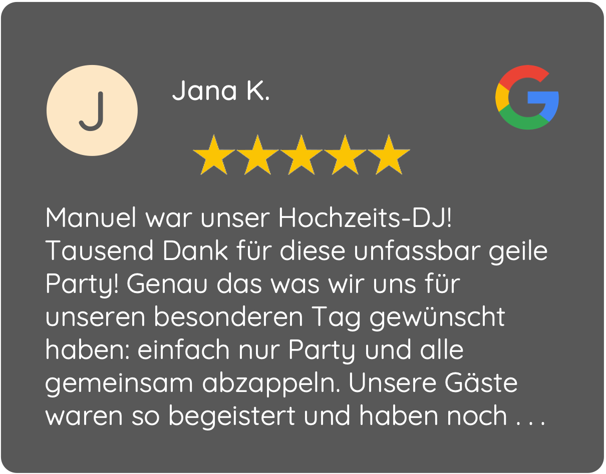Ich bin Manuel, besser bekannt als Menju-B und hauptberuflich professioneller Hochzeits- & Event-DJ. Für eine Vielzahl von Veranstaltungen ist die Musik das wichtigste Element! Als DJ ist es meine Aufgabe, diesen Teil so erfolgreich wie möglich zu gestalten. Hierbei spielt die jahrelange Erfahrung eine wichtige Rolle. Lange war ich Resident-DJ in NRWs größter Diskothek ‚Prater Bochum‘ und habe deutschlandweit auf zahlreichen anderen Veranstaltungen gespielt. Die höchstmögliche Leistung meiner Tätigkeit steht für mich an oberster Stelle! Jede Veranstaltung hat es verdient, als unvergessliches Erlebnis in Erinnerung zu bleiben.